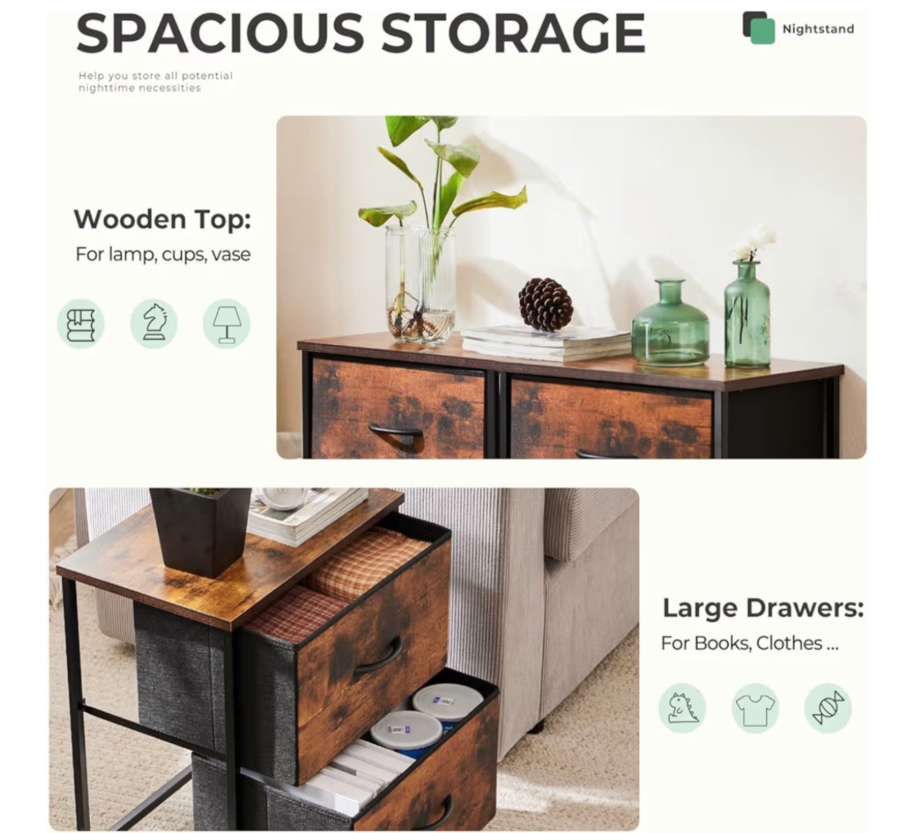 - 【Ample Storage – Keep Essentials Organized】With two spacious fabric drawers, COZIFURNI nightstand offers generous storage for your nighttime essentials, such as books, remote controls, or accessories. The sturdy wood top is perfect for holding your alarm clock, phone, charger, and eyeglasses, keeping everything within arm’s reach for ultimate convenience.