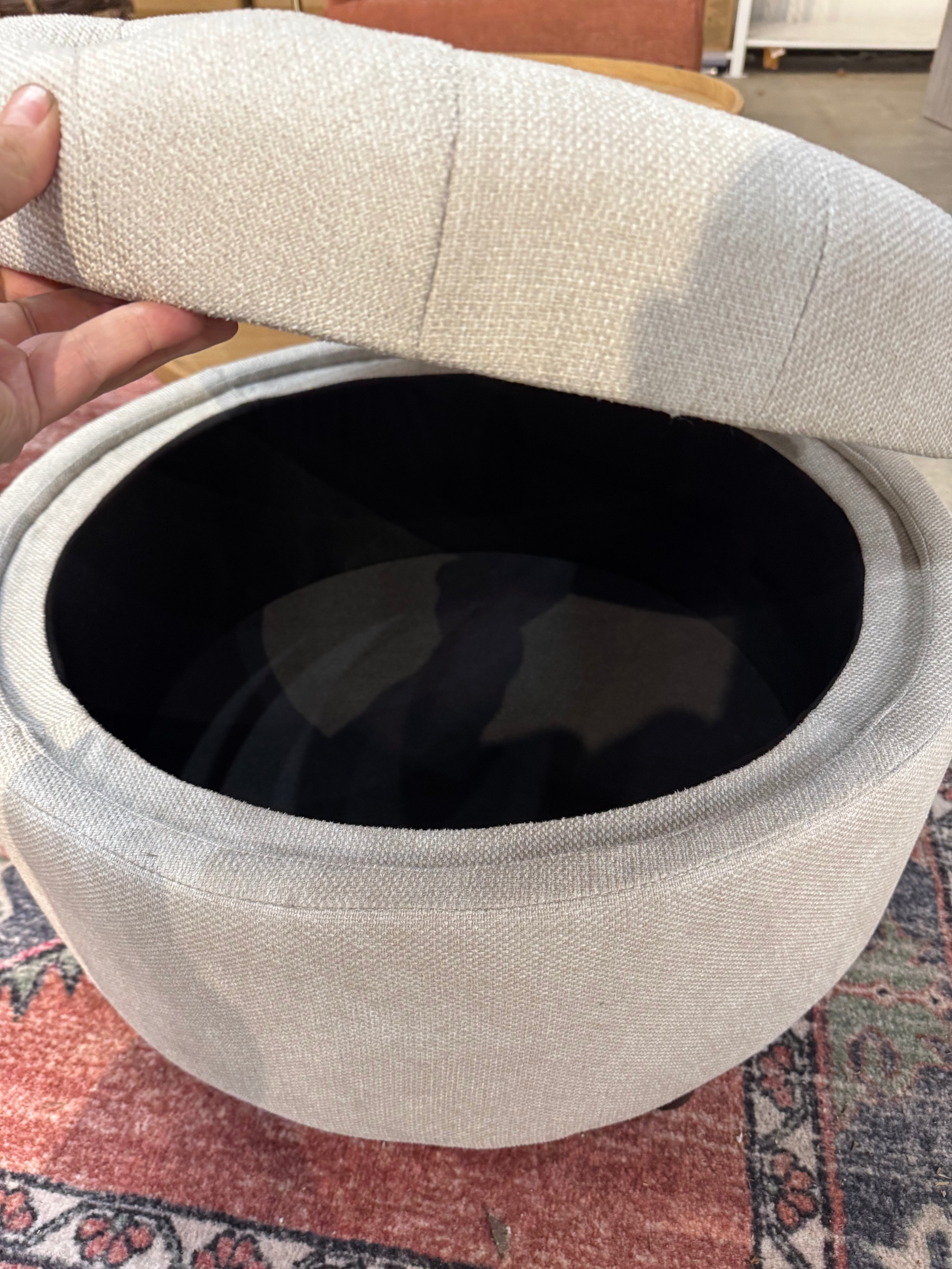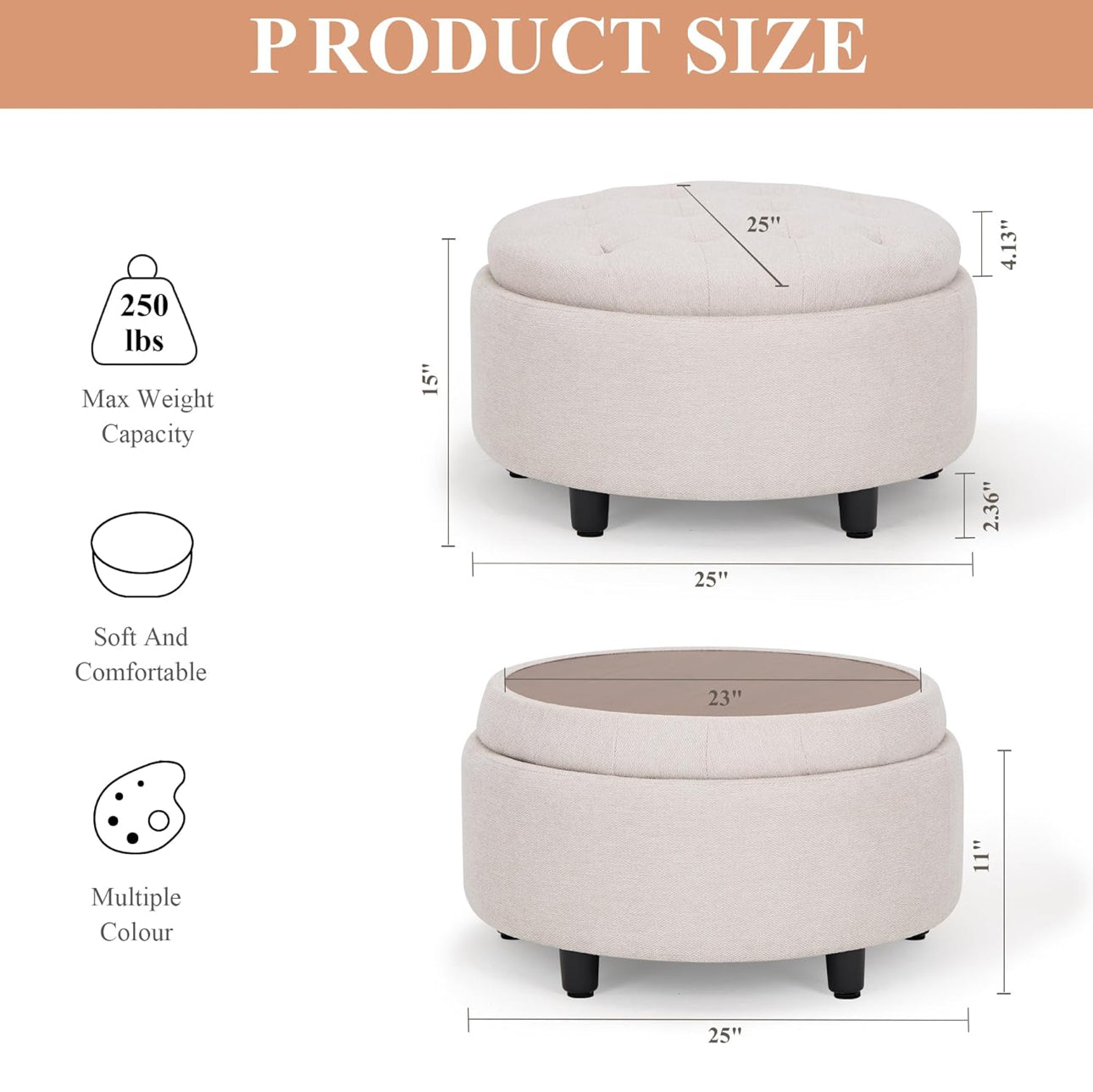 Beige Fabric Round Storage Ottoman with Reversible Tray Lid – Multi-Functional Footrest, Hidden Storage, Sturdy & Stylish Small Coffee Table for Living Room, Bedroom, or Entryway(Beige)