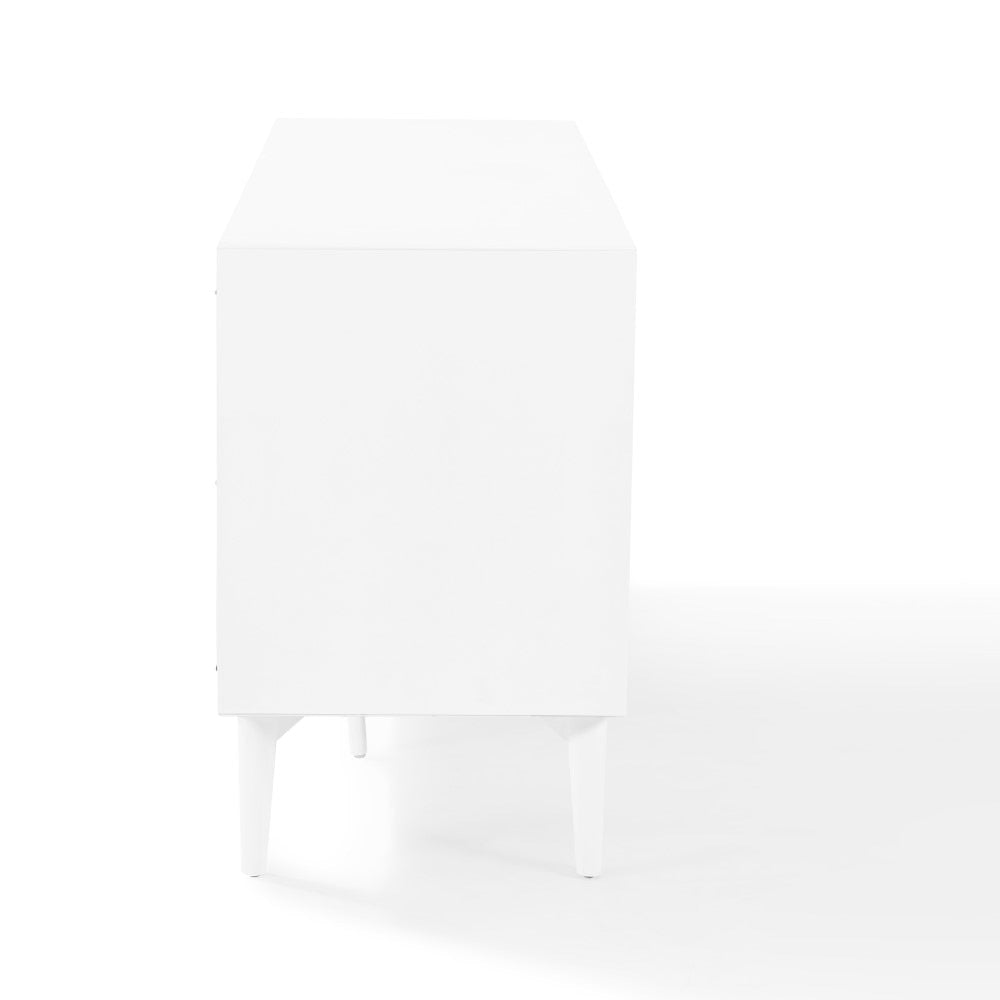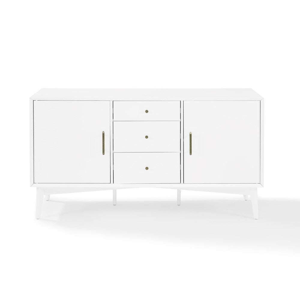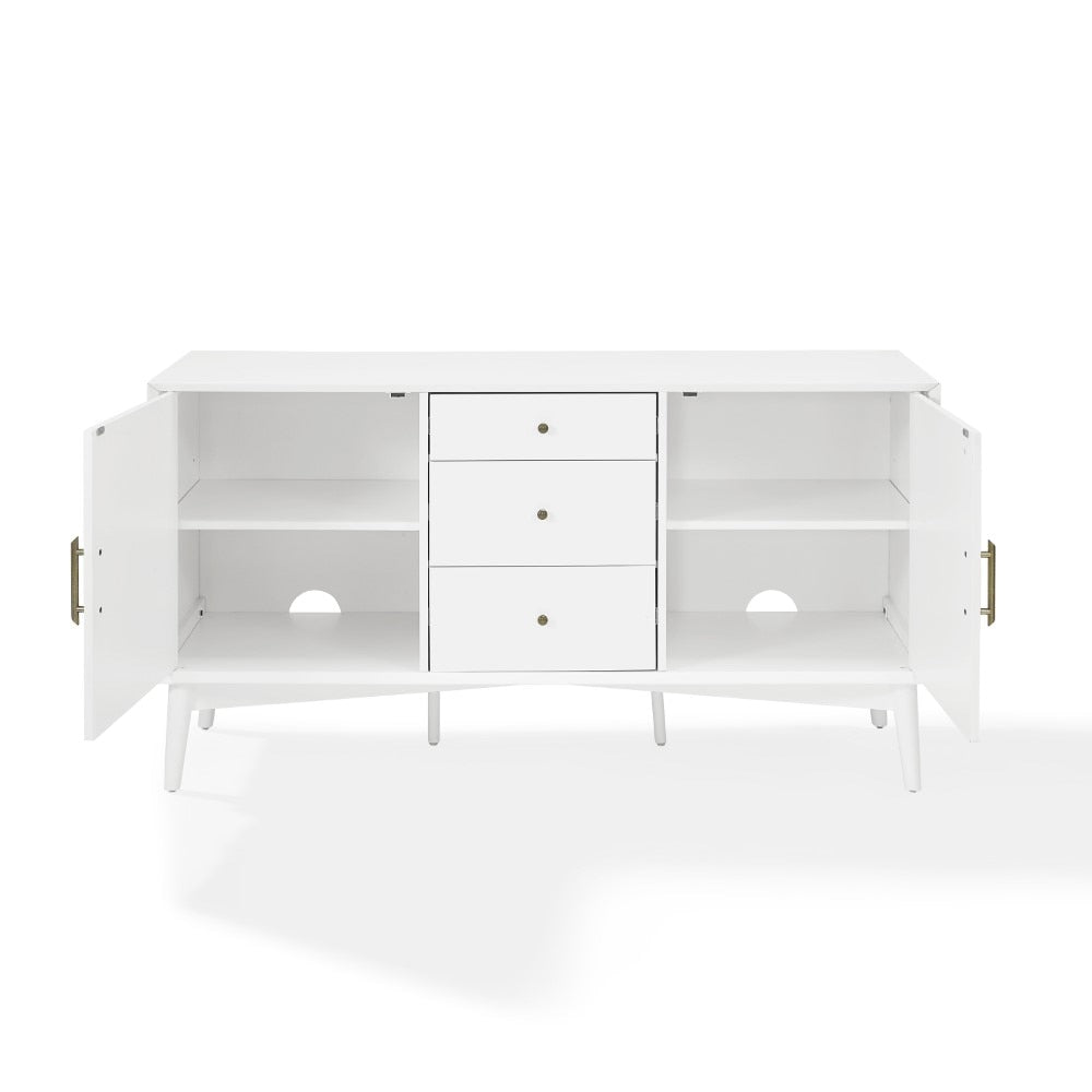 This Crosley Landon Buffet (white finish) brings mid-century modern elegance to dining rooms, living rooms, or entryways. Crafted from solid poplar and engineered wood, it features two side cabinets with adjustable shelving and three center drawers on full-extension glides for easy access. Genuine metal hardware, tapered legs, and cable management cutouts give it both style and function as a media cabinet or sideboard .