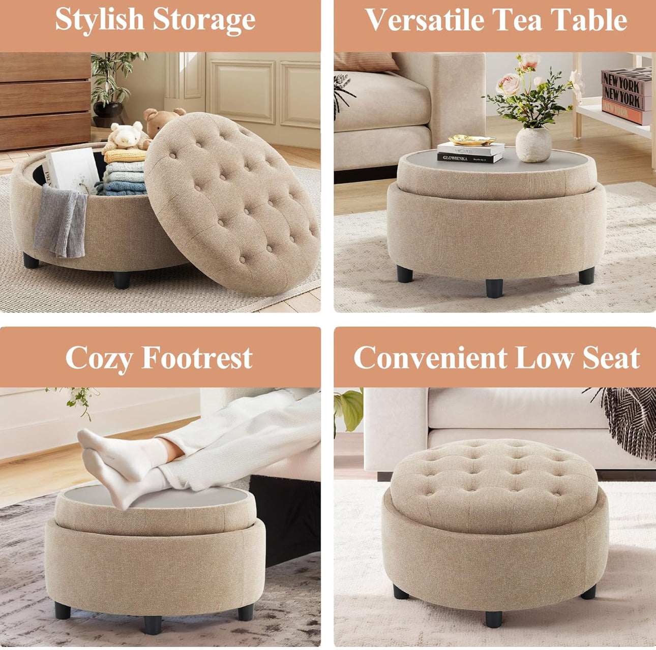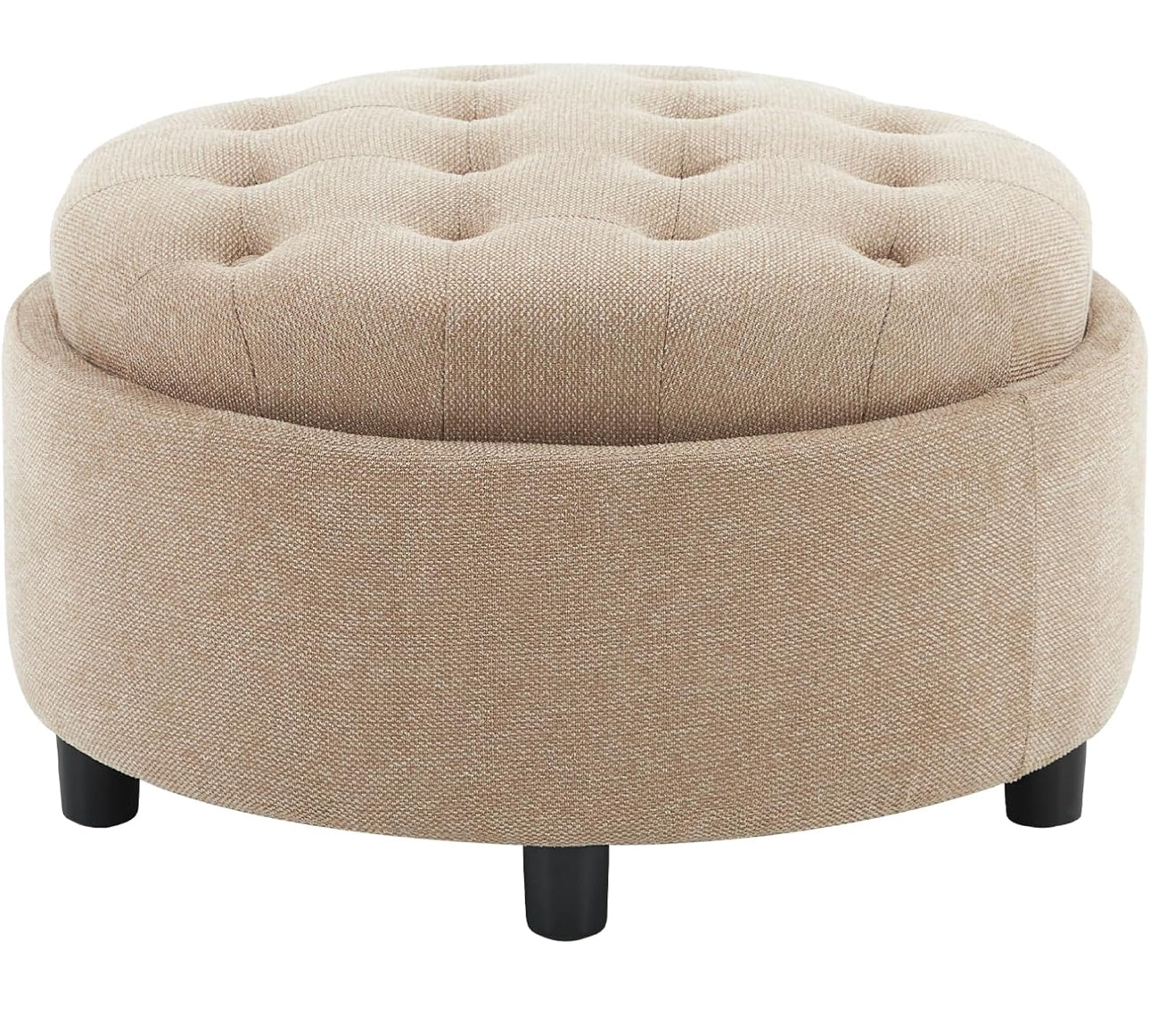 Round Storage Ottoman with Tray Lid – Fabric Footrest with Hidden Storage, Camel