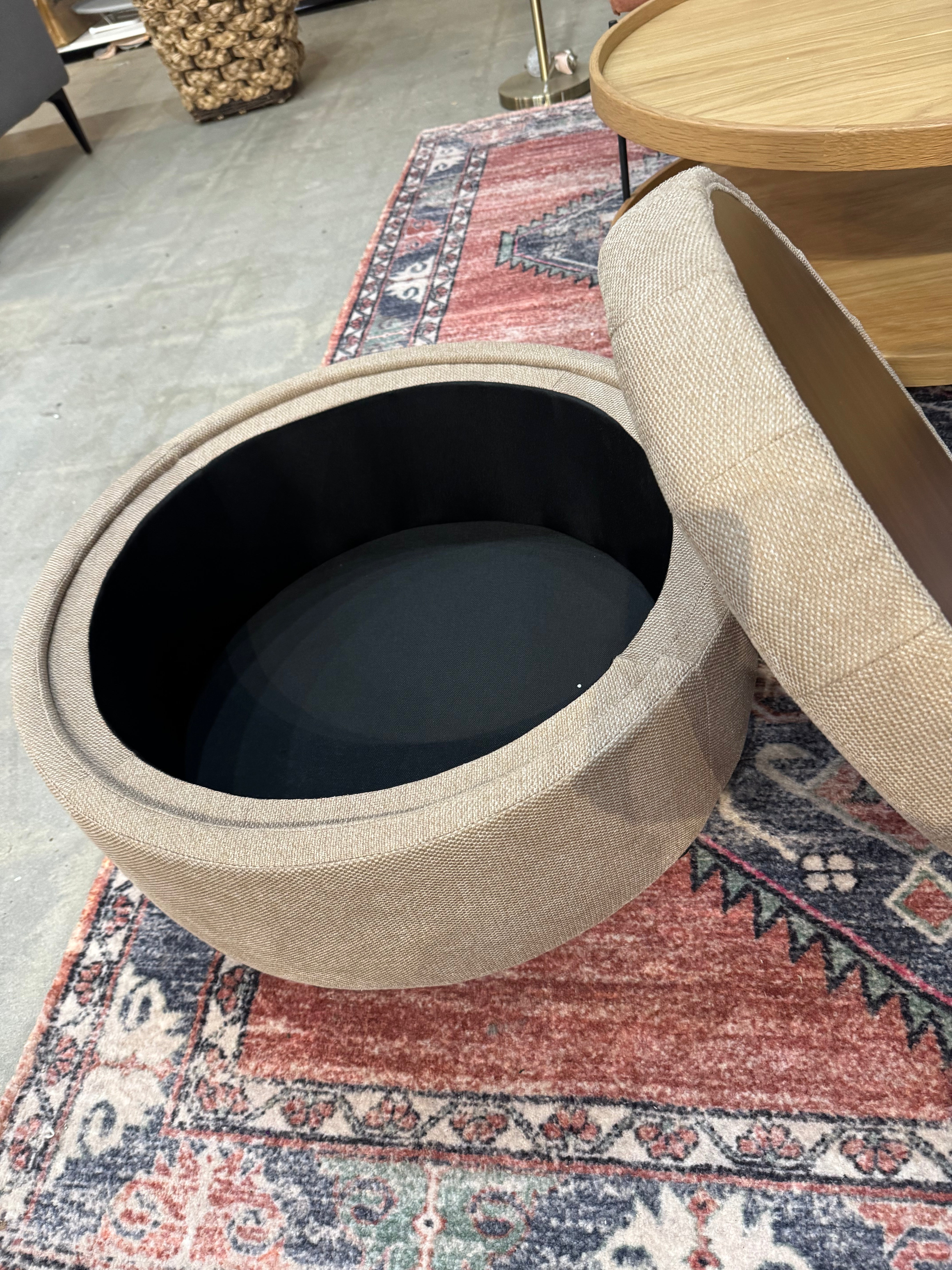 Round Storage Ottoman with Reversible Tray Lid – Fabric Footrest, Hidden Storage, Camel