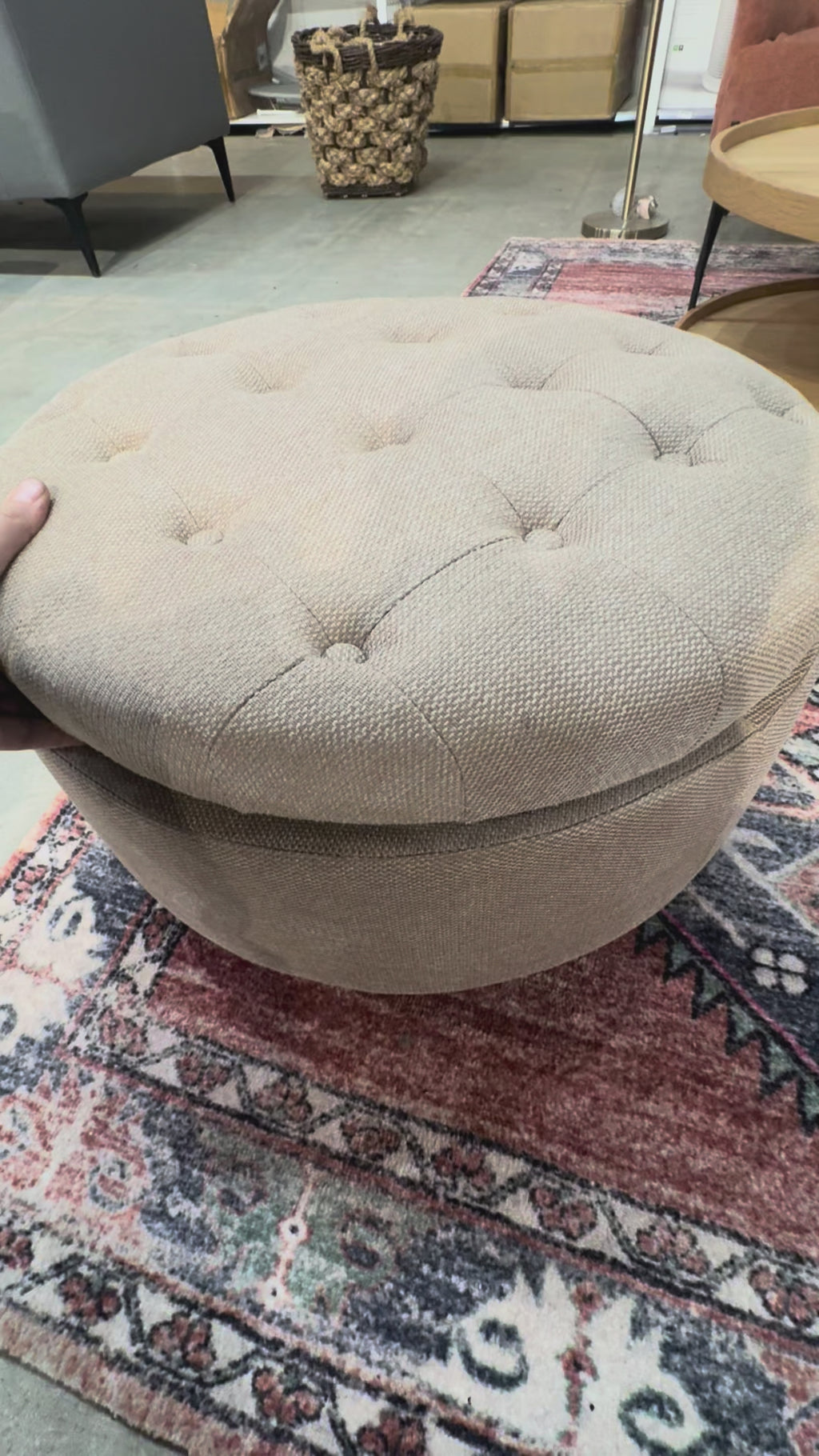 Condition: new - open box Product Dimensions: Ottoman:25"L*25"W*15"H Shipping Dimensions: 26” by 13” by 28” weight: 20.3 lbs  SKU: K311  color: CAM-FB Location: showroom  Product Information:  Round Storage Ottoman with Reversible Tray Lid – Fabric Footrest, Hidden Storage, Camel Round Storage Ottoman with Tray Lid – Fabric Footrest with Hidden Storage,...