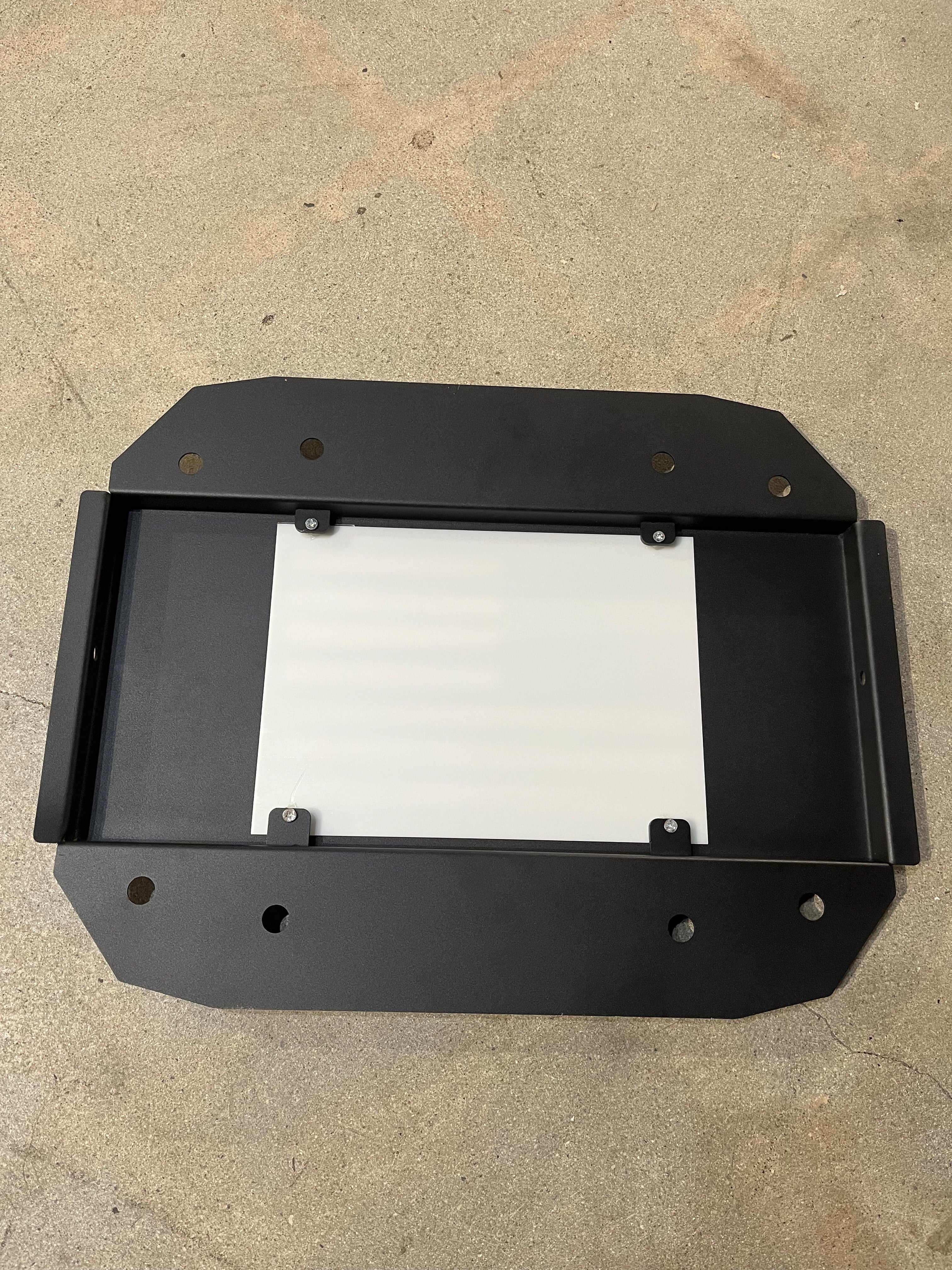- the rear spare tire holder cover plate is laser cut from durable Aluminum alloy then texture black powder coat to match the stock plastic parts. The filler plate uses all stock bolts to mount and features laser cut slots in the center of the plate for tailgate venting.