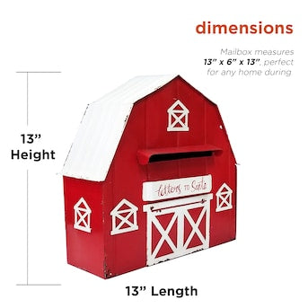 Upgrade your holiday display with the 13 in tall Alpine Corporation Letters to Santa Red Barn Mailbox! This festive display features a charming country barn look and embossed details, perfect for decorating your indoor or outdoor Christmas display. It's a fun way to collect Santa's letter requests from children and grand children as well as store Christmas cards. The side door opens easy to collect those precious letters and cards. Constructed of iron, this weather-resistant statue is built to withstand harsh winter temperatures and heavy snow for years to come. Measuring 14 in x 6 in x 13 in , Alpine Corporation's Letters to Santa Red Barn Mailbox is the perfect addition to your holiday decor.