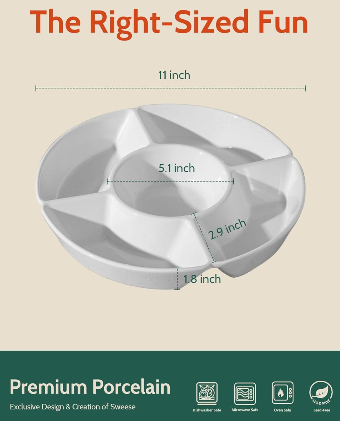 Porcelain Chip & Dip Serving Set – Divided Platter with 5 Compartments for Snacks, Veggies, Candy, Microwave & Dishwasher Safe, Elegant White