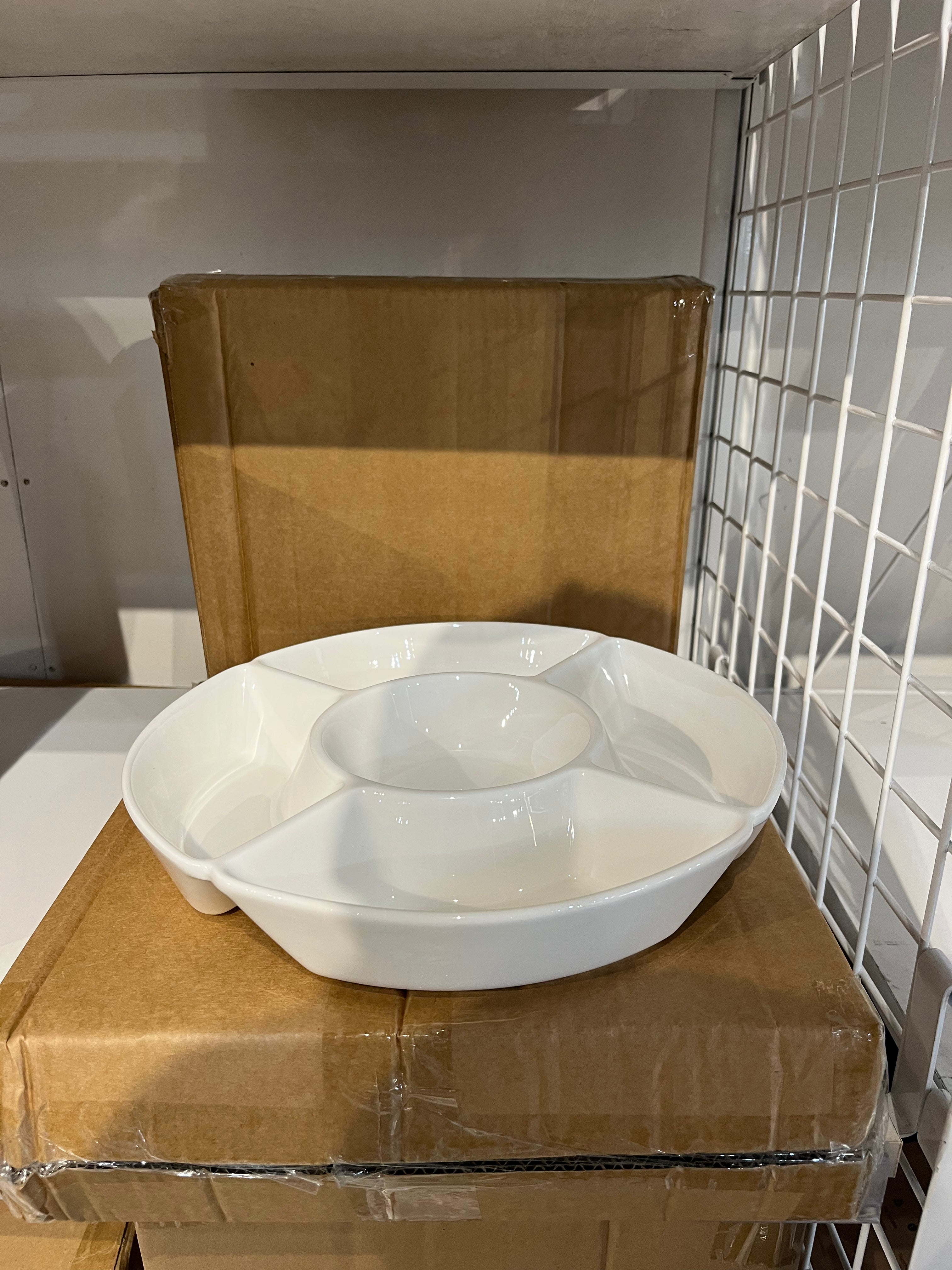 Product Information: Elegant white porcelain serving set featuring a divided platter with 5 compartments, perfect for snacks, veggies, candy, and more.