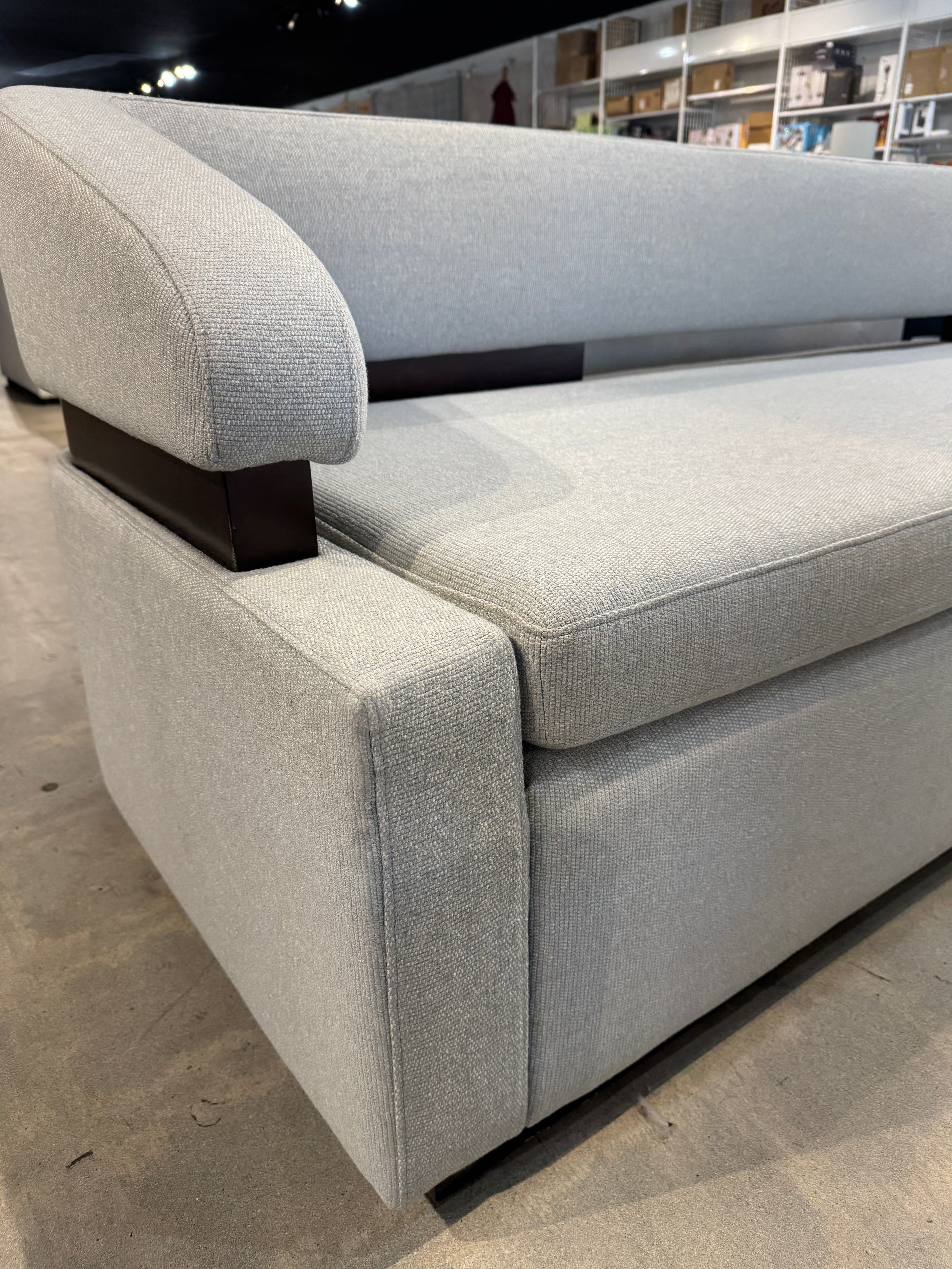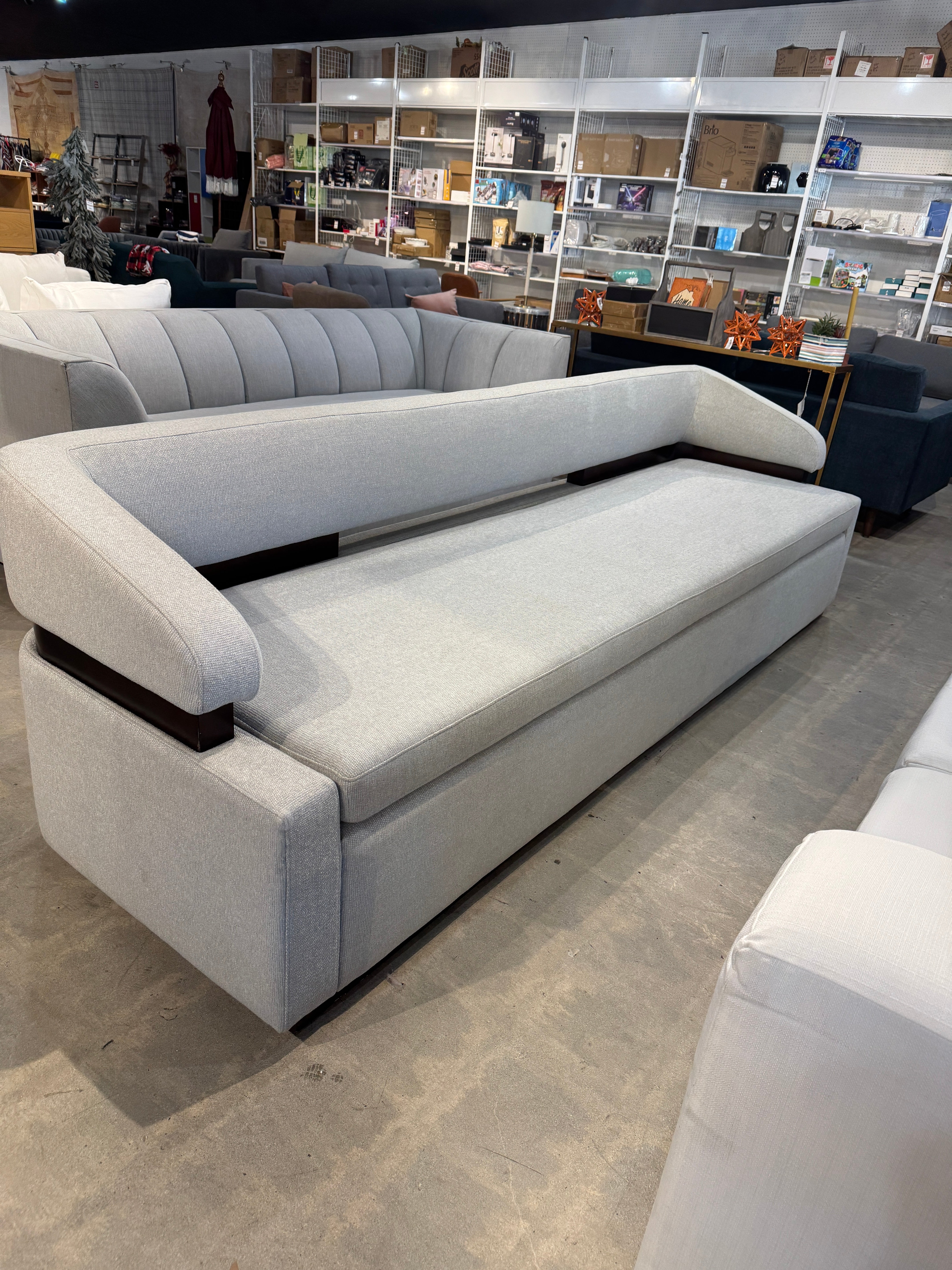 A stunning statement piece inspired by the Vienna Way Collection by Marmol Radziner, this 108-inch modern club sofa embodies the perfect balance of architectural design and refined comfort. Its sculptural silhouette features angular wrap-around arms, dark wood trim accents, and tailored upholstery in a soft gray woven fabric that complements any sophisticated interior.